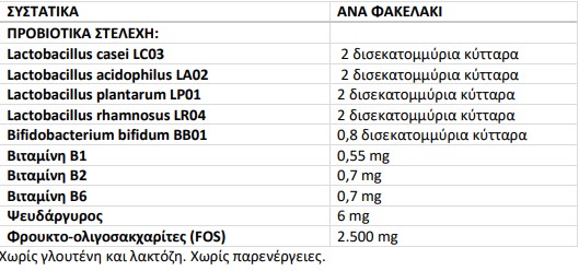 Εγγυημένα προβιοτικά (8,8 δισεκατομμύρια κύτταρα) έως τη λήξη τους για την αντιμετώπιση της διάρροιας, μη γενετικώς τροποποιημένα, σε συνδυασμό με FOS, Βιταμίνες Β1 - Β2 - Β6 και Ψευδάργυρο.
