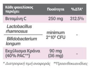 Τα Lactobacillus & Bifidobacterium είναι στελέχη που παρατηρούνται συχνά στο μικροβίωμα του ουροποιητικού και επιδεικνύουν προστατευτικό ρόλο έναντι των παθογόνων μικροβίων. Το εκχύλισμα cranberry είναι πλούσιο σε προανθοκυανιδίνες που εμποδίζουν τα βακτήρια E. coli να επικολληθούν στα επιθηλιακά κύτταρα του ουροποιητικού μειώνοντας την πιθανότητα να αναπτυχθεί λοίμωξη μέσω του πολλαπλασιασμού τους.