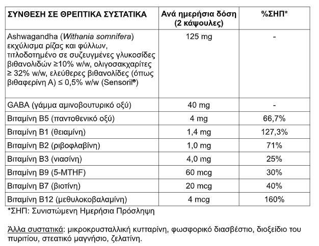 Σύμπλεγμα βιταμινών Β (B1, B3, B5, B7, B9, B12) : Συμβάλλει στη φυσιολογική νοητική επίδοση και τη φυσιολογική λειτουργία του νευρικού συστήματος.