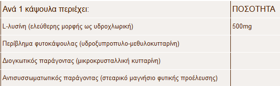 Το Solgar® L-Lysine 500 mg Vegetable Capsules παρέχεται σε ελεύθερη μορφή, είναι Κοσέρ και κατάλληλο για χορτοφάγους και άτομα που ακολουθούν αυστηρή χορτοφαγική διατροφή. 1-2 κάψουλες την ημέρα προσφέρουν 500 - 1000 mg L-Λυσίνης.
