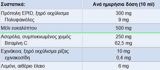 Συμβάλλει στην ενίσχυση της φυσικής άμυνας του οργανισμού, τονώνει το ανοσοποιητικό σύστημα, καταπραΰνει τον ερεθισμένο λαιμό ενώ παράλληλα προστατεύει την άνω αναπνευ- στική οδό.