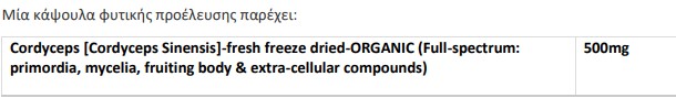 Μανιτάρι Cordyceps βιολογικής καλλιέργειας, αποξηραμένο με τη μέθοδο της φρέσκιας ψυχρής ξήρανσης (fresh freeze dried) που εξασφαλίζει αναλλοίωτες τις θρεπτικές του ιδιότητες. Σημαντική η συμβολή του σε πολλά πεδία της υγείας. Βιολογικό μανιτάρι Κόρντισεπς (Cordyceps sinensis) φρέσκιας ψυχρής ξήρανσης, που εξασφαλίζει αναλλοίωτες τις θρεπτικές του ιδιότητες και έτσι έχει καλύτερη ενζυμική δραστηριότητα, βιοδιαθεσιμότητα και, συνεπώς, μέγιστη αποτελεσματικότητα. Πληθώρα ερευνών έχουν αναδείξει τη σημαντική συμβολή του σε πολλά πεδία της υγείας. Το Cordyceps είναι προσαρμογόνο βότανο και συμβάλει σημαντικά στην καλύτερη διαχείριση του οξυγόνου από τον οργανισμό, δίνοντας ενέργεια και αντοχή, στον καλύτερο λιπιδαιμικό έλεγχο (χοληστερίνη), στην ενίσχυση του ανοσοποιητικού και του αναπαραγωγικού συστήματος. Στην κινεζική ιατρική συχνά αναφέρεται ως «το θαύμα της φύσης».