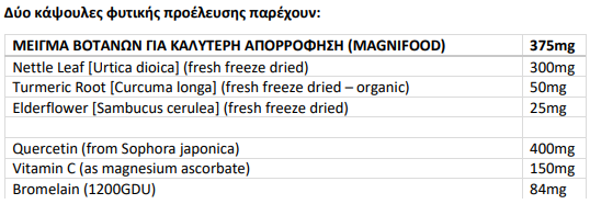 Μοναδικός συνδυασμός από κουερσετίνη, τσουκνίδα ψυχρής ξήρανσης, ρίζα κουρκουμά και σαμπούκο. Η κουερσετίνη είναι ένα μη κιτρικό βιοφλαβονοειδές υψηλής ισχύος, που συναντάται σε υψηλές ποσότητες στα μήλα και στα κρεμμύδια και οι ιδιότητες της την καθιστούν ένα τέλειο φυσικό αντιφλεγμονώδες. Θεωρείται η βασίλισσα των βιοφλαβονοειδών και είναι εξαιρετικά χρήσιμη σε περιπτώσεις αντιμετώπισης αλλεργιών. Η φρέσκια τσουκνίδα ψυχρής ξήρανσης φαίνεται από έρευνες να βοηθά στις περιβαλλοντικές αλλεργίες που επιβαρύνουν το αναπνευστικό, καθώς έχει μια έντονη φυσική αντισταμινική δράση. Ο κουρκουμάς χρησιμοποιείται παραδοσιακά για την δημιουργία μιας ασπίδας απέναντι σε συγκεκριμένα αλλεργιογόνα ερεθίσματα και το elderflower περιέχει αντιφλεγμονώδη φλαβονοειδή και έχει θετική επίδραση στην βρογχική απόχρεμψη εξασφαλίζοντας έτσι την υποστήριξη του αναπνευστικού απέναντι στα αλλεργιογόνα.