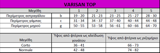 Οι θεραπευτικές κάλτσες διαβαθμισμένης συμπίεσης VARISAN TOP είναι πιστοποιημένες από Γερμανικό ινστιτούτο Ral και ικανές να ανταποκριθούν στις θεραπευτικές ανάγκες ακόμα και των πιο απαιτητικών ασθενών καθώς διασφαλίζουν την εξατομικευμένη εφαρμογή του προϊόντος επάνω στο πόδι του ασθενούς με 5 μεγέθη, 2 μήκη, ενώ όταν κάποιος από τους παραπάνω παράγοντες δεν αντιστοιχεί σε προκαθορισμένο μέγεθος υπάρχει η δυνατότητα ειδικής κατασκευής κάλτσας επάνω στο πόδι του ασθενούς.